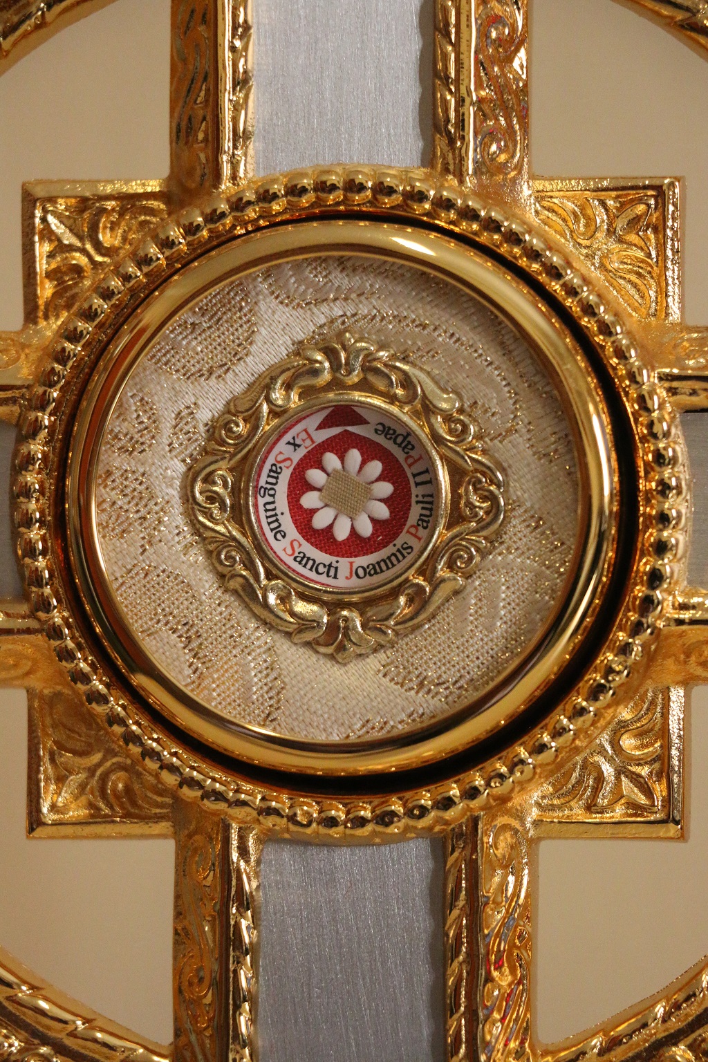 Conocedor del profundo afecto y devoción que los piuranos y tumbesinos guardan a San Juan Pablo II, nuestro Arzobispo Metropolitano, Monseñor José Antonio Eguren Anselmi S.C.V., una vez concluida la XXXI Jornada Mundial de la Juventud que tuvo por sede a Cracovia (Polonia) en el mes julio de 2016, escribió al entonces Arzobispo de dicha ciudad, Eminentísimo Señor Cardenal Stanislaw Dziwisz, antiguo secretario personal del Papa San Juan Pablo II, para solicitarle el envío de una reliquia de primer grado para que puesta en un relicario sea permanentemente mostrada a la veneración de los fieles y de esta manera la intercesión del Papa Santo nos guarde de todo mal, nos renueve siempre en la esperanza cristiana y nos dé aliento para la Nueva Evangelización. El Cardenal Dziwisz atendiendo el pedido de Monseñor Eguren, ha tenido a bien donar a nuestra Arquidiócesis una partícula de la sangre de San Juan Pablo II. Se trata entonces de una reliquia de primer grado o clase ya que ella ha formado parte del cuerpo del santo.