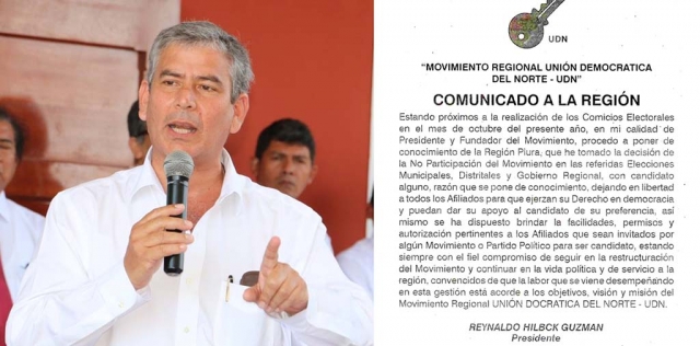 “He tomado la decisión de la no participación del movimiento en las elecciones municipales, distritales y gobierno regional con candidato alguno. Se deja en libertad a todos los afiliados para que den su apoyo al candidato de su preferencia, o ser invitados algún otro partido para ser candidatos”, señala el comunicado colgado en su cuenta personal de Facebook.