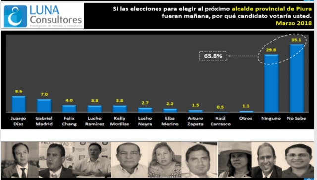 ERP. La encuesta dada a conocer por Luna Consultores en el mes de marzo, respecto a la intención de voto de los piuranos para las elecciones de la municipalidad provincial de Piura, indica que no existe candidato con altas preferencias y la distancia entre uno y otros son mínimas. Al contrario, los entrevistados se inclinaron por ninguno y no sabe no opina el mismo que significa el 68,8%.