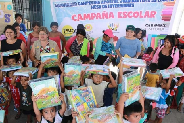 ERP. La Mesa de Inversiones de la Comunidad Campesina Apostol Juan Bautista de Locuto, en el marco de su compromiso con la niñez y de apoyo a las poblaciones en extrema pobreza, hizo entrega de un aporte consistente en paquetes escolares completos que beneficiarán directamente a más de 2,500 escolares que vienen recibiendo clases en educación inicial, primaria y secundaria en colegios del distrito de Tambogrande en Piura.