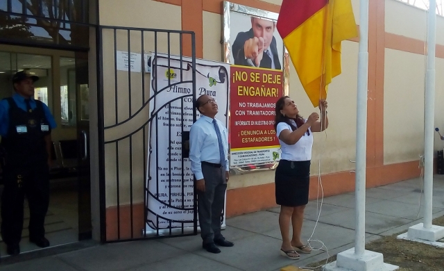 El compromiso de los trabajadores se dio durante la ceremonia de izamiento del pabellón nacional, realizada en el frontis de la institución y presidida por el Ing. Jaime Saavedra Diez, director Regional de Transportes de Piura.