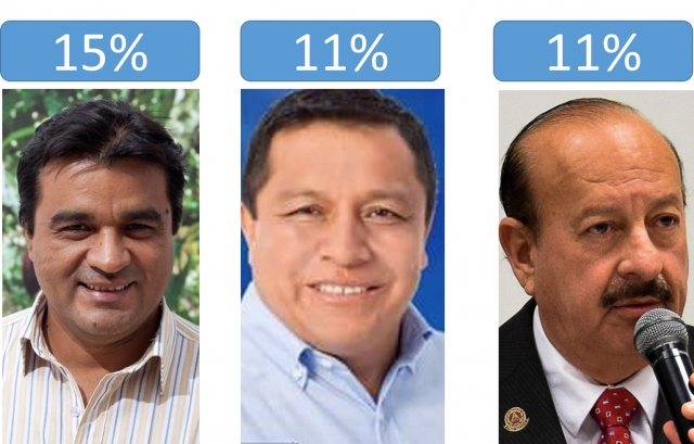 La sorpresa sería Servando García Correa, quien de acuerdo al sondeo obtiene un 10%, es decir un punto menos de Huayama y de Elera. En tanto Jhony Peralta Cruz, obtendría solo un 9% de la intención de voto. Peralta ha logrado consolidarse en Sullana y Talara. En este caso, la elección se irá definiendo voto a voto, si consideramos el margen de error del sondeo de opinión.