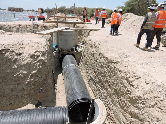 Raúl Cabanillas, residente de obra, comentó que este sistema de bombeo cuenta con tuberías de fibra de vidrio, de 600 milímetros de diámetro, pues se proyecta tener una caudal mayor. En la actualidad, se tiene un caudal de ingreso 500 y 700 LPS, pero en la primera etapa estará preparada para un caudal 900 LPS, y por el período de diseño a 20 años se está estimando un caudal de 1,200 LPS.