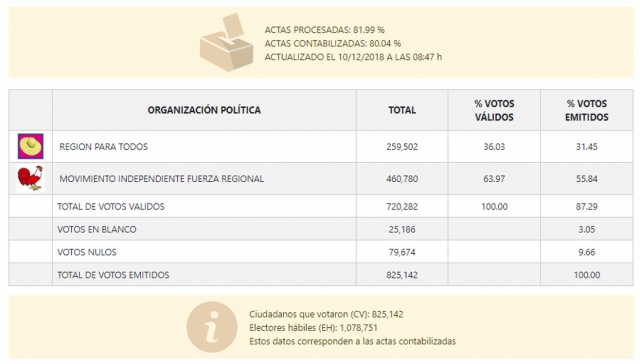 De acuerdo a los avances, el Movimiento Independiente de Fuerza Regional obtuvo 460,780 votos que significan el 55,84% de los votos emitidos, en tanto que con parcentajes de votos válidos es del 63.97%. El movimiento Región para Todos obtiene hasta el momento 259,502 votos que emitidos significa el 31.45%, en tanto que los votos válidos son el 36,03%.