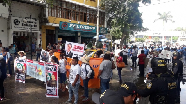 ERP. Un grupo de piuranos salieron a las calles para reclamar libertad y justicia a favor del suboficial Elvis Miranda, actualmente en prisión preventiva por decisión del Juzgado de primera instancia y ratificada por la Sala Penal de la Corte Superior de Justicia de Piura. Los manifestantes se ubicaron en la avenida Grau a inmediaciones del óvalo del mismo nombre, para vitorear su nombre y censurar la decisión judicial.