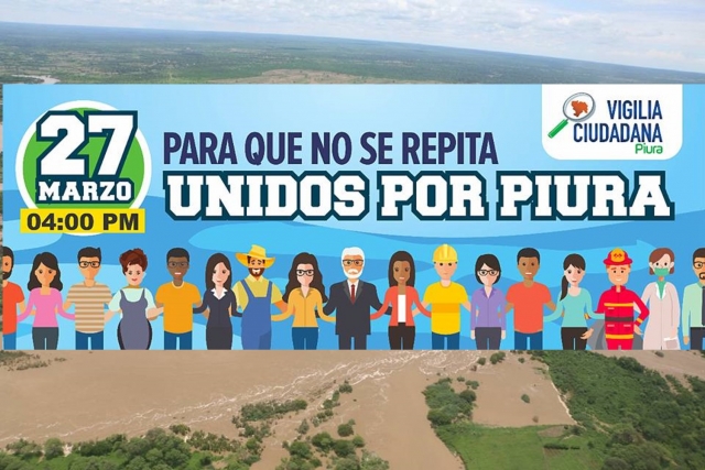 ERP. No es una fecha para celebrar sino para recordar y para llamar a la acción. El colectivo Vigilia Ciudadana de Piura ha tenido la original idea de convocar a los piuranos, para movilizarse a las 4 de la tarde de este 27 de marzo, la misma que han denominado "Para que no se repita, Unidos por Piura" tras la propuesta, la población, representes de instituciones, sociedad civil se han comprometido con esta actividad.