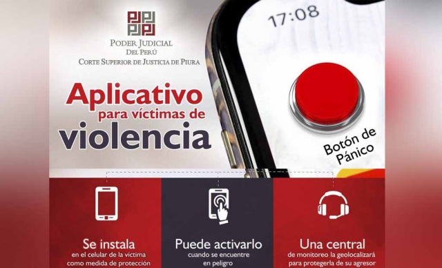 ERP. La Corte Superior de Justicia de Piura, con el apoyo de la Policía Nacional y las Municipalidades de Piura, Castilla y Veintiséis de Octubre, pondrá en funcionamiento la aplicación tecnológica “botón de pánico”, la misma que permitirá avisar, en tiempo real, cuando una víctima corre peligro a causa de su agresor.
