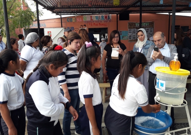 Durante su recorrido a la institución educativa, la delegación observó las etapas de almacenamiento, preparación y consumo de los alimentos, así como interactuar con los usuarios del programa, docentes, padres y madres de familia y autoridades locales del sector salud y educación.