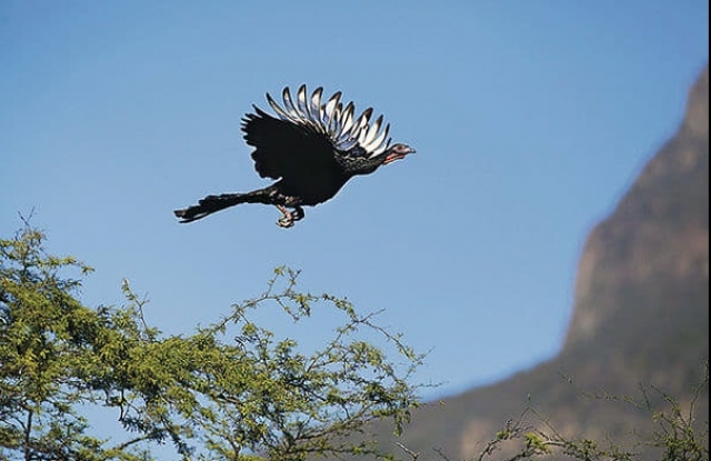 La “Pava aliblanca” es un ave esbelta de color negro con nueve grandes plumas de vuelo blancas en los extremos de las alas, pico gris azulado con punta negra. Cara desnuda de color rosado grisáceo. Posee una larga cola, patas rosadas y su gargantilla se encuentra desnuda, y es de color anaranjado. Mide entre 70 y 80 cm de longitud, su población no supera los 200 ejemplares. Su extinción se debe a la depredación del bosque, la caza furtiva y lenta reproducción básicamente.