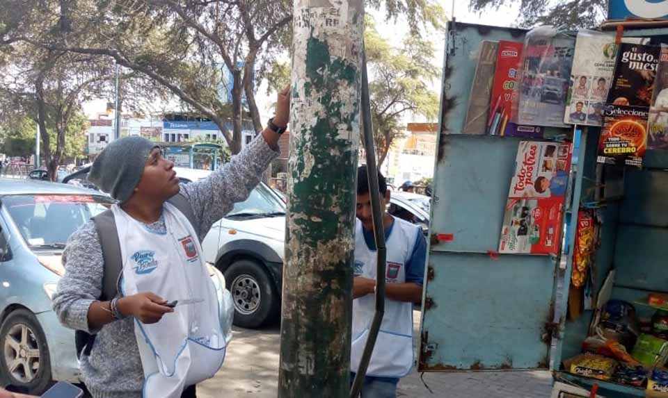 ERP. En el Día Mundial de la Limpieza, voluntarios ambientales de la Gerencia de Medio Ambiente, a cargo de Isabel Pizarro Cornejo, se sumaron a las labores de erradicación de la publicidad que es colocada de manera inescrupulosa en los postes de alumbrado público del centro de la ciudad.