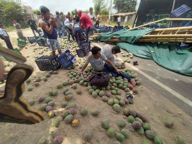 El hecho sucedió esta tarde cuando el camión de placa de rodaje P3P transportaba varias cajas de mango de exportación desde el sector de Malingas con dirección a Tambogrande y de pronto el chofer al parecer el chofer perdió el control del vehículo sufriendo la volcadura quedando la fruta regada en la vía.