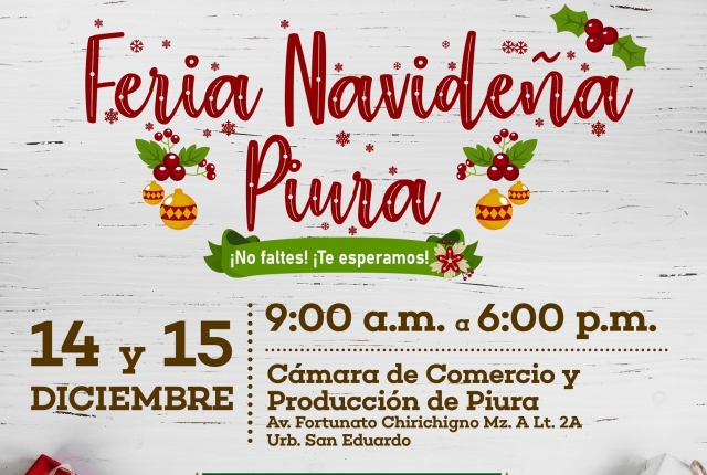 ERP. A pocos días de celebrar la Navidad, la Cámara de Comercio y Producción de Piura y el Ministerio de la Producción (Produce), invitan a la ciudadanía, a visitar la Feria Navideña Piura que se realizará los días 14 y 15 de diciembre, de 9.00 a.m. a 6.00 p.m., en la sede del gremio empresarial.