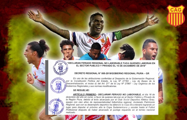 Según se indica el documento, la iniciativa se debe a la propuesta del médico Eddy Anthony Leyva Villalonga, el cual solicita que se declare como feriado no laborable compensable el día 16 de diciembre del 2019, medida que comprende al sector público y privado. Toma como referencia que el Atlético Grau “es un equipo con cien años de representatividad futbolística regional que ha logrado innumerables triunfos y alegrías (…)”.