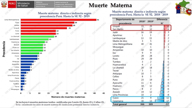 309 mujeres fallecieron por muertes directas e indirectas al 2019, siendo Lima el departamento con mayor cantidad de casos presentados, seguida de Piura. Cercanos se encuentran Loreto, Ucayali, Puno y Junín.