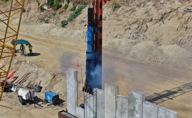 A la par de la colocación de las tablestacas, maquinaria pesada, también trabaja en el corte de terreno para proceder con la conformación del dique de protección. Es de precisar que aquí ya se rellenó a una altura de 1.20 metros y se seguirá este procedimiento hasta llegar a los 7 metros de altura a lo largo de la intervención.