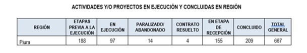 De setiembre de 2017 a noviembre de 2019, se identificaron 442 obras y servicios en ejecución (16%), 104 paralizadas y abandonadas (4%), 589 en etapa de recepción (21%) y 25 con contratos resueltos (cancelados 0.9%). Asimismo, se evidenciaron 915 obras y servicios concluidos (33%), de los cuales 396 se encontraban sin liquidación y 519 con liquidación.