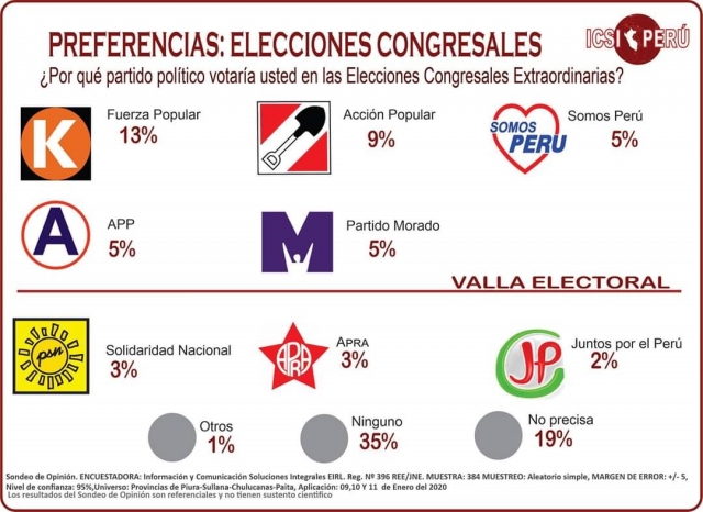ERP. La enciestadora ICSI Perú realizó su último estudio electoral y los resultados se mantienen con una alta indefinición. Si las elecciones fueran mañana, el partido Fuerza Popular lograría un 13% de los votos, 9% lograría el partido Acción Popular; en tanto que Somos Perú, Alianza para el Progreso y Partido Morado, obtendrían 5% de los votos de los piuranos. El sondeo se realizó el 9,10 y 11 de enero.