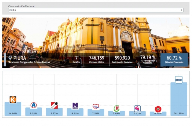 Al 60.72% del procesamiento de actas, la tendencia se mantiene con algunos cambios en la votación preferencial de varios de los partidos. De acuerdo a este porcentaje, Fuerza Popular tiene el 14.86% de los votos válidos; siguen en prelación Alianza para el Progreso con el 9.02%; Partido Morado 8.31%, 8.77% Acción Popular, 7,54% Somos Perú, Juntos por el Perú, 5.48% de los votos de Piura.
