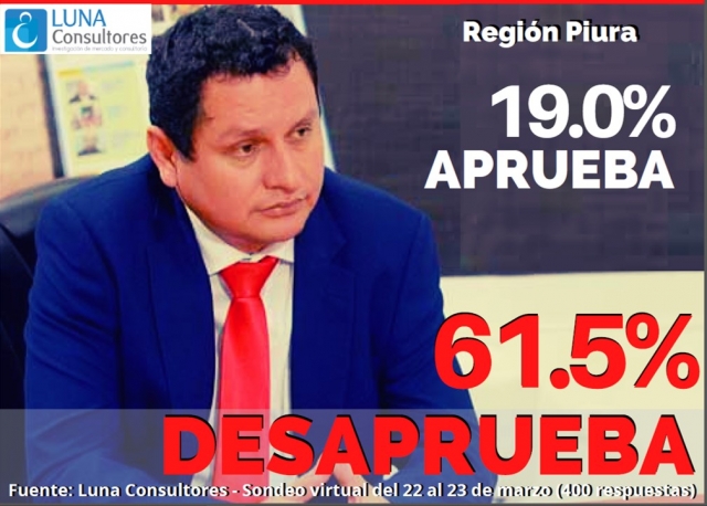Piura, es la segunda región con mayor casos de coronavirus a nivel nacional, la sensación de tener hospitales colapsados, con personal médico carente de insumos de salud, sin pruebas de descarte contra el virus, con los ansiados proyectos hospitalarios a nivel regional que se han atrasado o con el mínimo avance, juegan en contra del gobernador, a quién sólo el 19.0% aprueba, mientras que el 19.5% no la supo responder, de acuerdo el estudio de Luna Consultores.