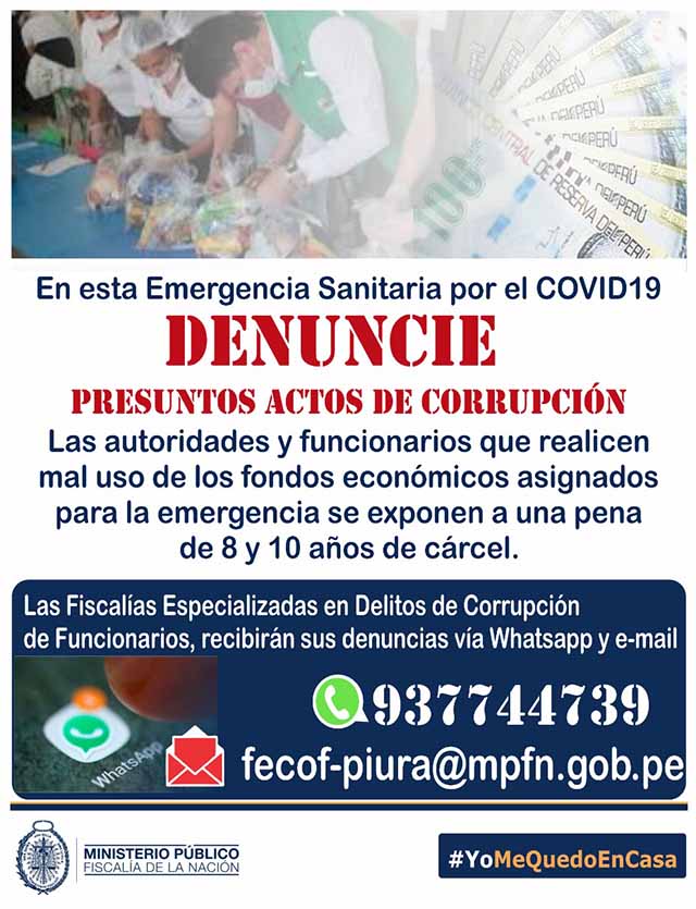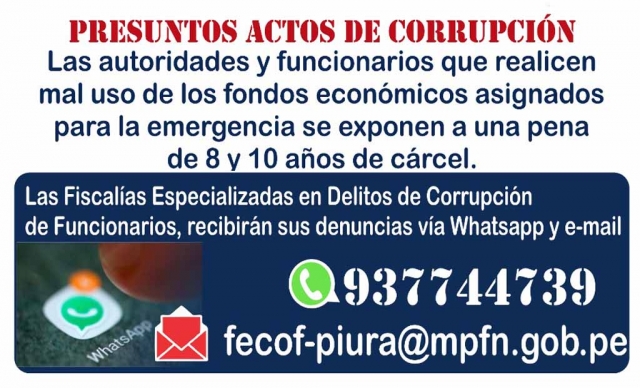 La Fiscal Superior dio a conocer al Gerente Regional de Control que a nivel nacional el Ministerio Público ha dispuesto activar un número de whatsapp y una dirección de correo electrónico para que la ciudadanía pueda remitir sus denuncias, acompañadas en la medida de lo posible de fotografías y/o documentos, que den cuenta sobre presuntos actos de corrupción; habiéndose habilitado en el Distrito Fiscal de Piura el número 937744739 para recibir mensajes vía Whatsapp y la dirección de correo electrónico