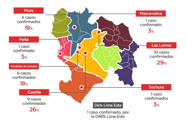 ERP. Los casos positivos de Covid-19 en la región Piura subieron a 34, según el último reporte de la autoridad santaria. De acuerdo al cuadro difundido por la Dirección Regional de Salud, el distrito de Las Lomas tiene 10 positivos, en tanto que Castilla le sigue con 9. Piura y Veintiséis de Octubre, registran en total 12 casos, situación que incrementa la alerta para que se extremen las medidas de seguridad.