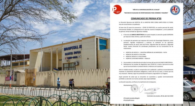 ERP. La dirección Ejecutiva del Hospital de la Amistad Perú Corea Santa Rosa II-2 Piura, a través de un comunicado de prensa dio a conocer que dos casos de coronavirus-Covid19 positivos, en el personal de salud, clínicamente estable; por lo tanto en salvaguarda de la salud de los trabajadores y de la población en general, se ha tomado las siguientes medidas.
