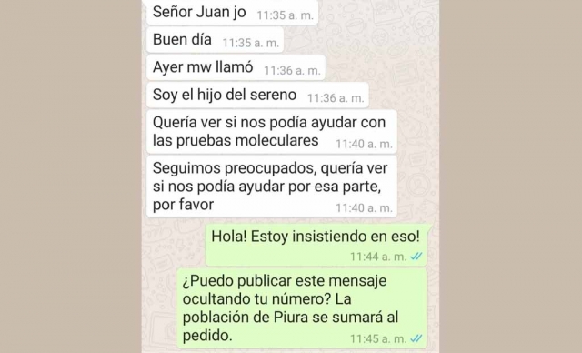 "Este mensaje me manda el hijo de nuestro sereno fallecido. Le he pasado esto al Gobernador y al Director Regional de Salud.Ayúdame a que su pedido sea escuchado", expresa el alcalde Juan José Díaz a través de facebook.