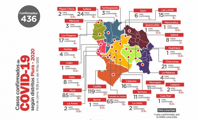 El distrito de nacimiento del gobernador Servando García tiene 2 casos confirmados; en tanto que Huarmaca de la misma provincia se ha determinado como positivo 1. En Chulucanas, se tiene21 personas infectadas, 4 en la Matanza y Morropón 11; en el caso de Piura, como hemos manifestado la propagación del virus es mayor; 119 en Castilla, 85 en Piura, 65 en Veintiséis de Octubre, 16 en Catacaos, 1 en Cura Mori, 2 en la Unión y 2 en la Arena.