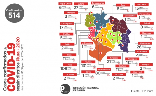 ERP. Los contagios avanzan en la región Piura, donde Castilla, Piura y Veintiséis de Octubre se convierten en los distritos de más alta incidencia del Covid-19, conforme el último reporte de la Dirección Regional de Salud de Piura. Son 514 casos más uno diagnosticado por la DIRIS Lima Este, de las cuales en las referidas a esta jurisdicción se han realizado 119 pruebas moleculares y 395 pruebas rápidas.