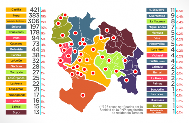 De acuerdo a la Oficina de Epidemiologia de la Dirección Regional de Salud de Piura, la mayor cantidad de casos se encuentran en el distrito de Castilla donde se han confirmado 421 contagiados; 383 del distrito de Piura, 306 de Veintiséis de Octubre, 197 de Sullana, 178 de Chulucanas, 94 de Paita, 73 de Catacaos, 44 de Bellavista de La Unión, 38 de Pariñas, 32 de La Unión, 28 de Sechura, 27 del distrito de Morropón, 25 de Los Órganos, La Arena 22, Las Lomas 21, Tambogrande 17, Colán 16, entre otros.