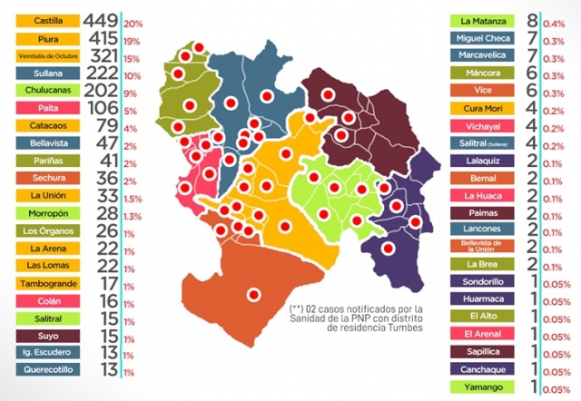 Según la cantidad de casos confirmados en la región Piura, el distrito de Castilla sigue adelante en los datos, es así que se han confirmado 449 personas infectadas; Piura le sigue en prelación con 415, el distrito Veintiséis de Octubre con 321, Sullana avanza peligrosamente con 222, Chulucanas con 202, Paita con 106, Catacaos 79, Bellavista de La Unión con 47, Pariñas con 41, Sechura con 36, La Unión con 33, Morropón con 28, Los Órganos 26, Las Lomas 22, La Arena 22, Tambogrande, 17, Colán 16, Salitral 15, Suyo 15, Ignacio Escudero 13, Querecotillo, 13.