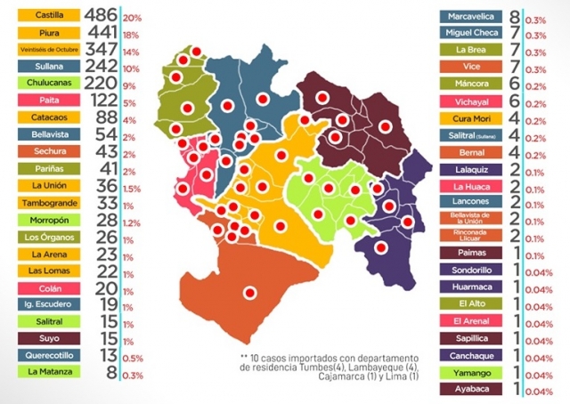 Para la presente nota y conforme lo venimos haciendo, utilizamos la información de la Diresa Piura, donde el distrito de Castilla tiene 486 casos confirmados, seguido de Piura con 441, Veintiséis de Octubre con 347, Sullana con 242, Chulucanas 220, Paita con 122, Catacaos, 88; Bellavista 54; Sechura 43, Pariñas 41, La Unión 36, Tambogrande 33, Morropón 28, Los Órganos 26, La Arena 23, Las Lomas 22. Pueblo Nuevo de Colán, 20; Ignacio Escudero 19 ; Salitral 15; Suyo 15, Querecotillo 13, La Matanza 8, Marcavelica 8, Miguel Checa, La Brea y Vice 7 cada uno; Máncora y Vichayal 6 cada uno; Cura Mori, Salitral de Sullana y Bernal 4 cada uno, en tanto que Lalaquiz, La Huaca, Lancones, Bellavista de La Unión y Rinconada Llicuar tienen 2 cada uno; igualmente solo con un caso están Paimas, Sondorillo, Huarmaca, El Alto, El Arenal y Sapillica con 1 cada distrito.