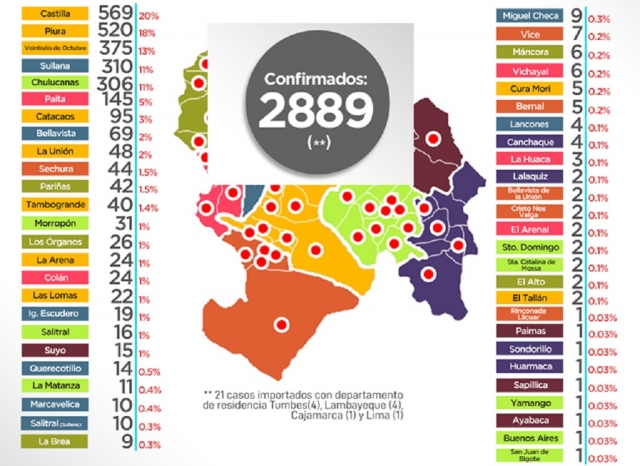 Asimismo, es necesario indicar la velocidad de contagio del distrito de Paita donde se reportan 145 personas afectadas; Catacaos 95, Bellavista 69, La Unión 48, Sechura 44, Pariñas 42, Tambogrande 40, Morropón 31, Los Órganos 26, La Arena 24, Colán 24, Las Lomas 22, Ignacio Escudero 19, Salitral, 16; Suyo 15, Querecotillo 14, La Matanza 11, entre otros. Es menester indicar que en algunos distritos los avances son lentos y se debe a las condiciones de cuidado de la propia población.