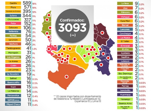 De acuerdo a la Oficina de Epidemiología de Piura, el distrito de Castilla es el que más casos de contagiados tiene con 589, seguido bastante de cerca de Piura con 571; Veintiséis de Octubre con 395, Sullana con 344, Chulucanas con 317; Paita con 152, Catacaos con 106, Bellavista de Sullana con 76, Pariñas con 54, La Unión con 50, Sechura con 46, Tambogrande con 41, Morropón con 31, Los Órganos, La Arena y Colán con 26 cada uno; Las Lomas con 23; Ignacio Escudero con 19; Salitral y Querecotillo con 16 cada uno; entre otros que pueden observarse en el siguiente cuadro.