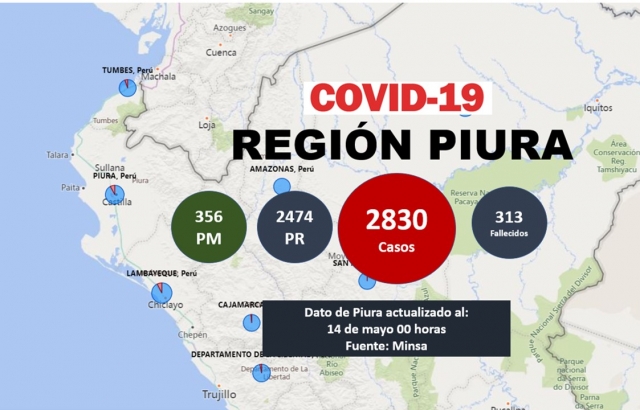 Como ya es usual en esta fuente, la cantidad de casos confirmados de Covid-19 que se reportan e informan son mayores al dato nacional. De acuerdo a la Oficina de Epidemiología de la Dirección Regional de Salud de Piura a un minuto de llegar al 14 de mayo, se registraron 3108 casos positivos y las muertes llegaron a 307 un poco menor que el dato nacional. Esta misa fuente no da el detalle distrito por distrito; en tal sentido, es conveniente mantenerse alerta para ver el crecimiento del Covid.19 en el territorio.