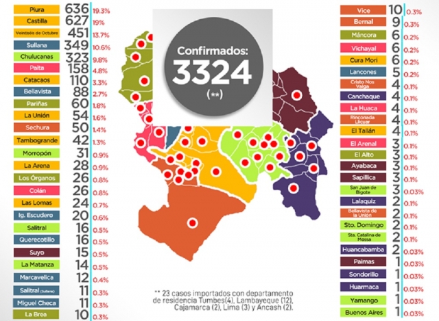 ERP. La Oficina de Epidemiología de Piura a cargo de la Dirección Regional de Salud informó los datos al 15 de mayo de Covid-19; indicando que desde el inicio de la pandemia se tiene 3324 casos confirmados, en tanto que los fallecidos llegan a 313, similar al dato nacional donde la constante es menos casos diariamente. De esta manera, se observa que el peligroso virus no se detiene en esta parte del pais.