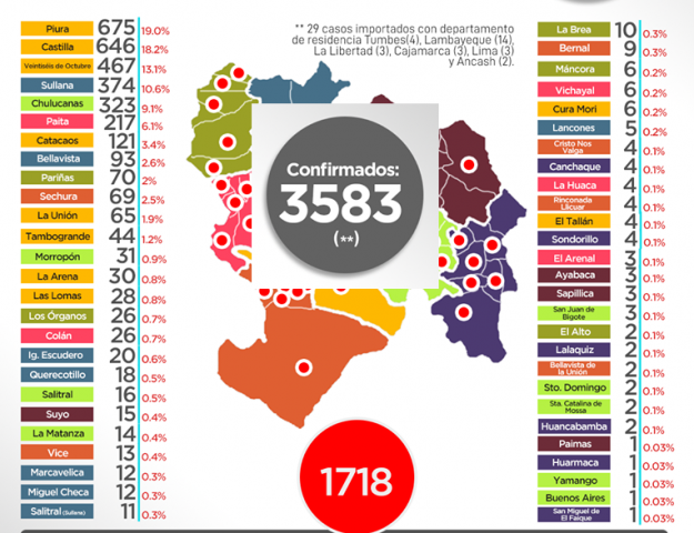 De acuerdo a la Oficina de Epidemiología de Piura, en los 3,583 casos confirmados de Covid-19, se tienen 29 importados de Tumbes, Lambayeque, La Libertad, Cajamarca, Lima y Ancash. En el detalle, el distrito de Piura superó a su similar de Castilla, ahora se tiene 675 y 646 respectivamente. El distrito Veintiséis de Octubre registra 467, Sullana 374, Chulucanas 323, Paita 217, Catacaos 121, Bellavista 93, Pariñas 70, Sechura 69, La Unión 65, Tambogrande 44, Morropón 31, La Arena 30, Las Lomas 28, Los Órganos y Colán 26, Ignacio Escudero 20, Querecotillo 18, Salitral 16, Suyo 15.