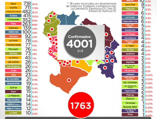 ERP. La Oficina de Epidemiología de la Dirección Regional de Salud de Piura, confirmó 4001 casos de Covid-19, considerando en dicha cifra 30 importados de Tumbes, Lambayeque, La Libertad, Cajamarca, Lima, Ancash y Huánuco. De acuerdo al detalle de la fuente regional los fallecidos son 383 dos menos que el dato proporcionado por el Instituto de Salud y Centro Nacional de Epidemiología, Prevención y Control de Enfermedades del Ministerio de Salud.