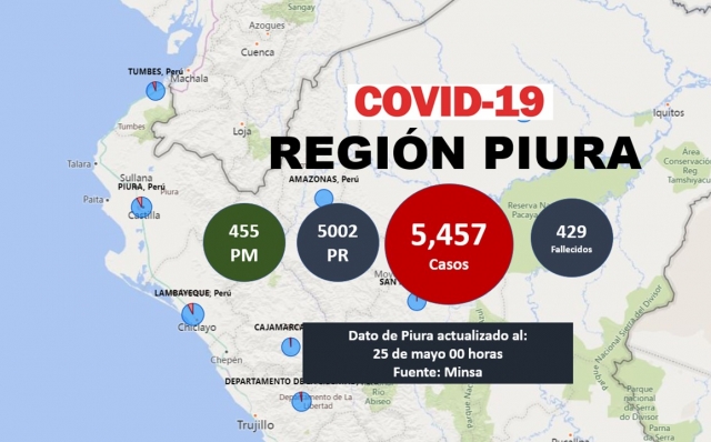 ERP. Preocupación mayor y protestas justificadas en la región Piura, pues los casos de Covid-19 siguen subiendo pese a las acciones que se realizan. Al 25 de mayo del 2020, el Instituto de Salud y Centro Nacional de Epidemiología, Prevención y Control de Enfermedades del Ministerio de Salud, informó que la región Piura tiene a la fecha 5,457 casos confirmados de Covid-19 y registra 429 fallecidos la misma cantidad de su informe anterior.