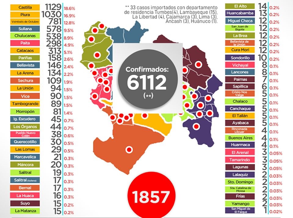 La oficina de Epidemiología de Piura, igualmente realizó su reporte, indicando la precisión distrito por distrito, aunque las cantidades siempre son superiores en casos confirmados, pero menores en fallecidos. Al 26 de mayo, se tiene 6112 personas afectadas por el Covid-19 incluyéndose a 33 importados de otras regiones; según esta fuente se reportan 433 fallecido, 8 menos de la fuente del Ministerio de Salud.
