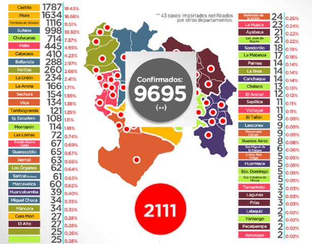 ERP. Los datos regionales son sorprendentes y demuestran la propagación del Covid-19 con mucha facilidad en los diversos distritos de esta jurisdicción. De acuerdo a la Oficina de Epidemiología de la Dirección Regional de Salud a la fecha la región Piura registra 9,695 casos contagiados, en tanto que los fallecidos llegan a los 620, es decir 72 más de lo que informa el Ministerio de Salud en la misma fecha.