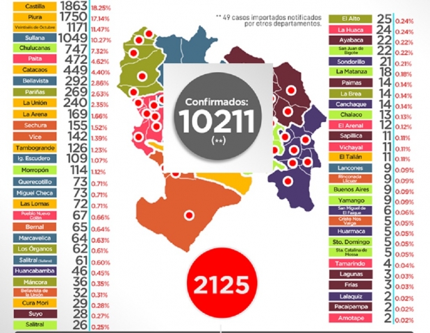 ERP. Según la Oficina de Epidemiología de la Dirección Regional de Salud de Piura, los casos de Covid-19 siguen en franco ascenso y registra a la fecha 10,211 un dato mayor a lo informado por el Ministerio de Salud; de igual manera, se precisa que a la fecha el número de fallecidos por esta enfermedad llega a los 635, el cual es igualmente superior al dato nacional.