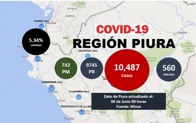 De acuerdo al reporte nacional que difunde el Instituto de Salud y Centro Nacional de Epidemiología, Prevención y Control de Enfermedades del Ministerio de Salud se tiene 10,487 casos confirmados de coronavirus, cifra superior a la Dirección Regional de Salud de Piura. Evidentemente a mayor casos y menos fallecidos la tasa de letalidad se reduce a 5.34%, dando una sensación, que podría ser errónea de lo que viene sucediendo en esta región.