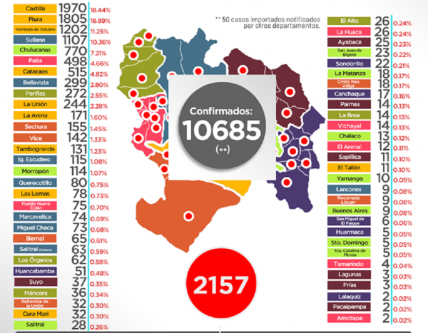 El distrito de Castilla, sigue siendo el principal foco de contagio y actualmente tiene 1970 casos confirmados, Piura 1805; Veintiséis de Octubre 1202; Sullana 1,107; Chulucanas 770; Paita, 498; Catacaos, 515; Bellavista de Sullana, 299; Pariñas 272; La Unión 244; La Arena 171; Sechura 155; Vice 142; Tambogrande 131; Ignacio Escudero 115; Morropón 114; Querecotillo 80; los otros detalles se encuentran en el cuadro adjunto.