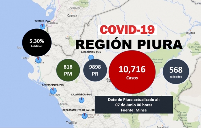 Conforme lo indicamos en la nota de la Oficina de Epidemiología de la Dirección Regional de Piura al 6 de junio se tenían 693 fallecidos y es probable que la cifra haya crecido en las siguientes 24 horas; sin embargo, para el Ministerio de Salud la cifra es menor con un desfase de un día y en función a dichos datos la tasa de letalidad es del 5.30%, lo que viene siendo cuestionado.