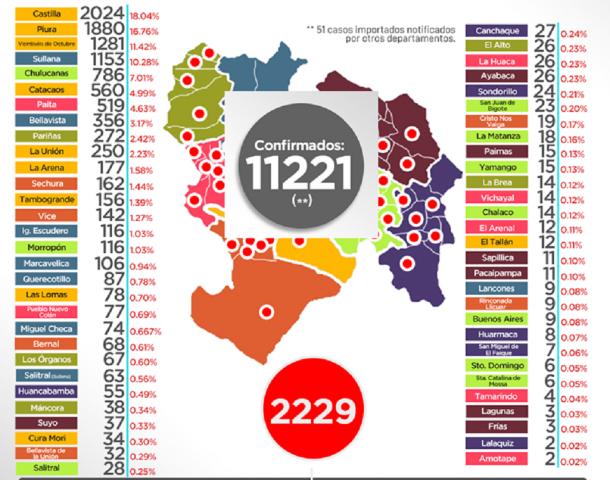ERP. La Oficina de Epidemiología de la Dirección Regional de Salud de Piura, mantiene sus datos diferentes al nacional pese a ser obtenidos a la misma hora y mismo día. Al 8 de junio y 00 horas, la Región Piura registra 739 fallecidos, 66 más al dato del Ministerio de Salud, en tanto que se tiene 11,221 casos confirmados por COVID-19. De acuerdo a la misma fuente, 2,229 pacientes fueron dados de alta, en tanto que 352 se mantienen hospitalizados.