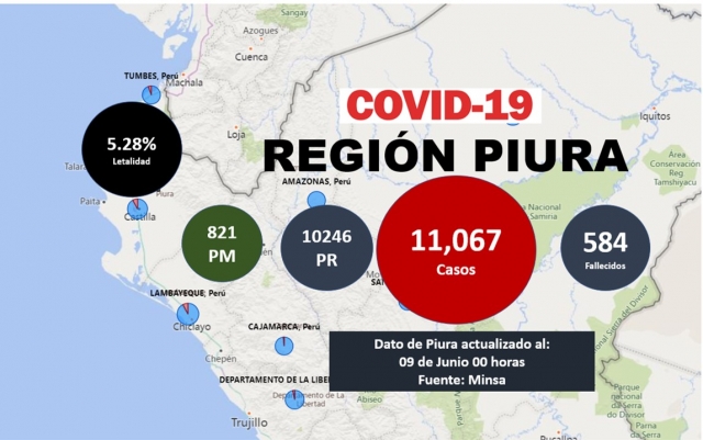 ERP. El Instituto Nacional de Salud y Centro Nacional de Epidemiología, Prevención y Control de Enfermedades del Ministerio de Salud. repitiendo las inconsistencias de los días previos, dio a conocer la data de COVID-19 indicando que casos confirmados llegan a los 11,067, en tanto que los fallecidos de acuerdo a esta fuente es de 584, lo que da una tasa de letalidad de 5.28%, porcentaje poco creíble que se contradice con la información de la DIRESA Piura.