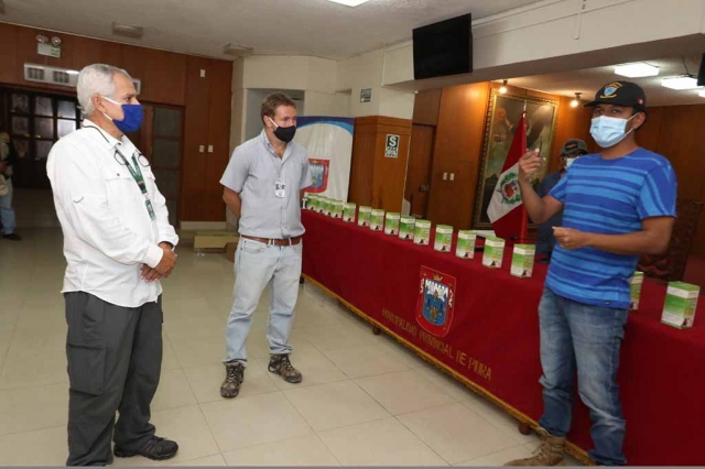 La donación fue recibida por el alcalde Juan José Díaz Dios, en el salón de actos Almirante Grau de la comuna piurana, donde se reunió con Fernando Sanchez Torres (ProAgro), Jorge Caballero Hoyos (Ecosac) y Pablo Eyheralde Munita (Rapel), quienes mostraron su compromiso para apoyar a la población en la lucha contra esta pandemia.