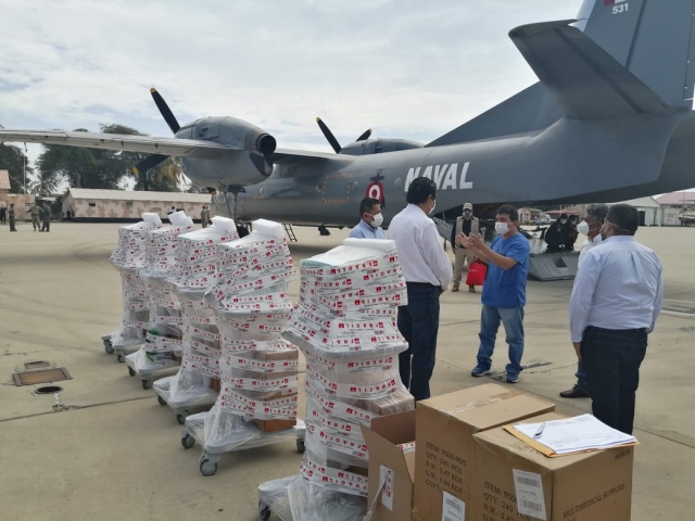 El envío consta de 18 mil unidades de azitromicina, 100 detergentes enzimáticos, 3 mil mascarillas N-95, 4 mil pantalones descartables, 2 mil lentes y 5 mil chaquetas descartables.
