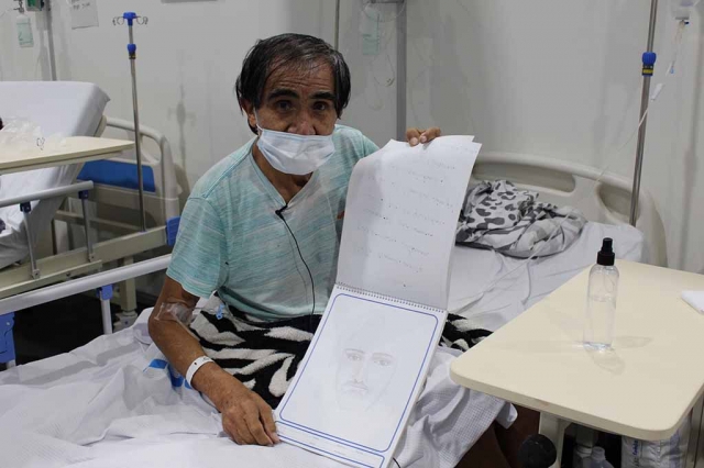 ERP. Tan solo un lápiz y un block de hojas blancas le bastan a don Manuel Orellana Calderón, de 75 años, para olvidar por unos minutos que se encuentra internado hace seis días en una cama de la 'Villa EsSalud Piura', luego que fuera diagnosticado como positivo para el nuevo coronavirus.
